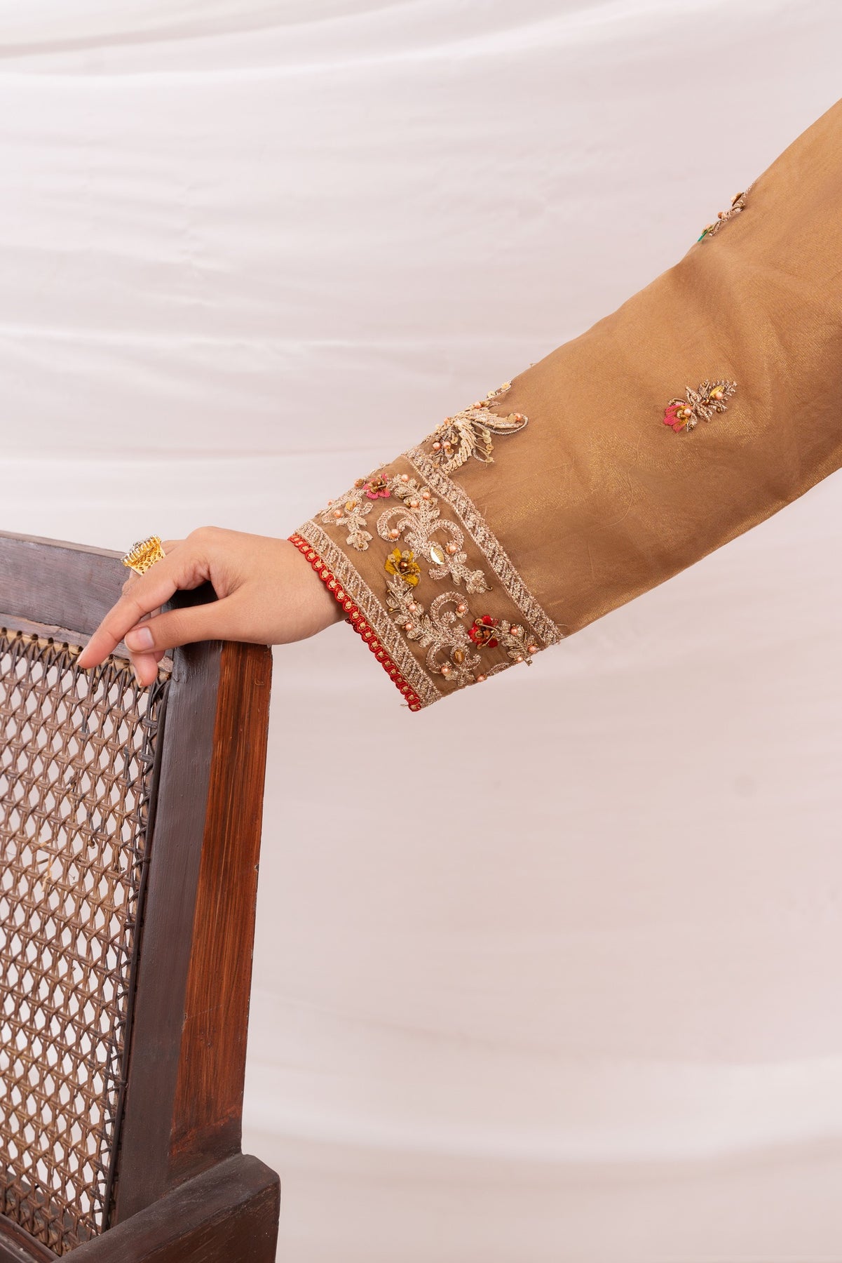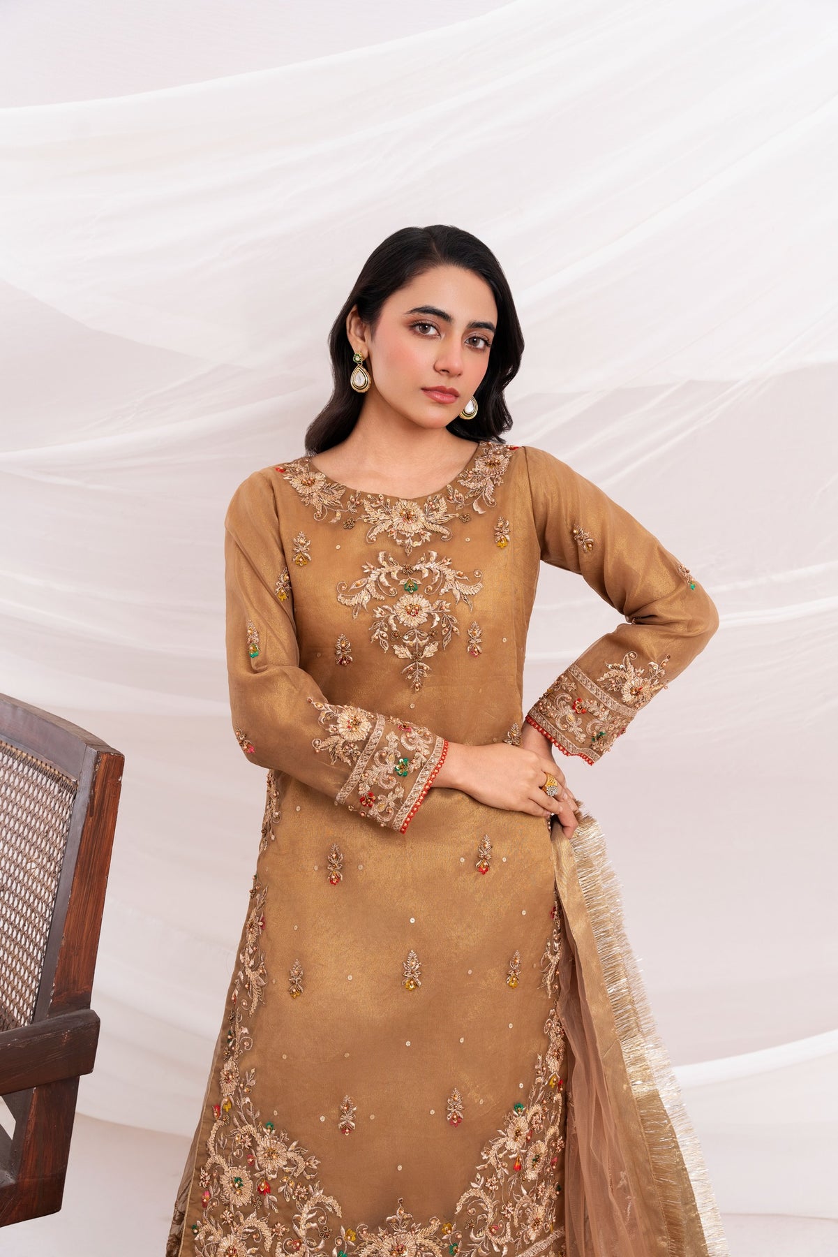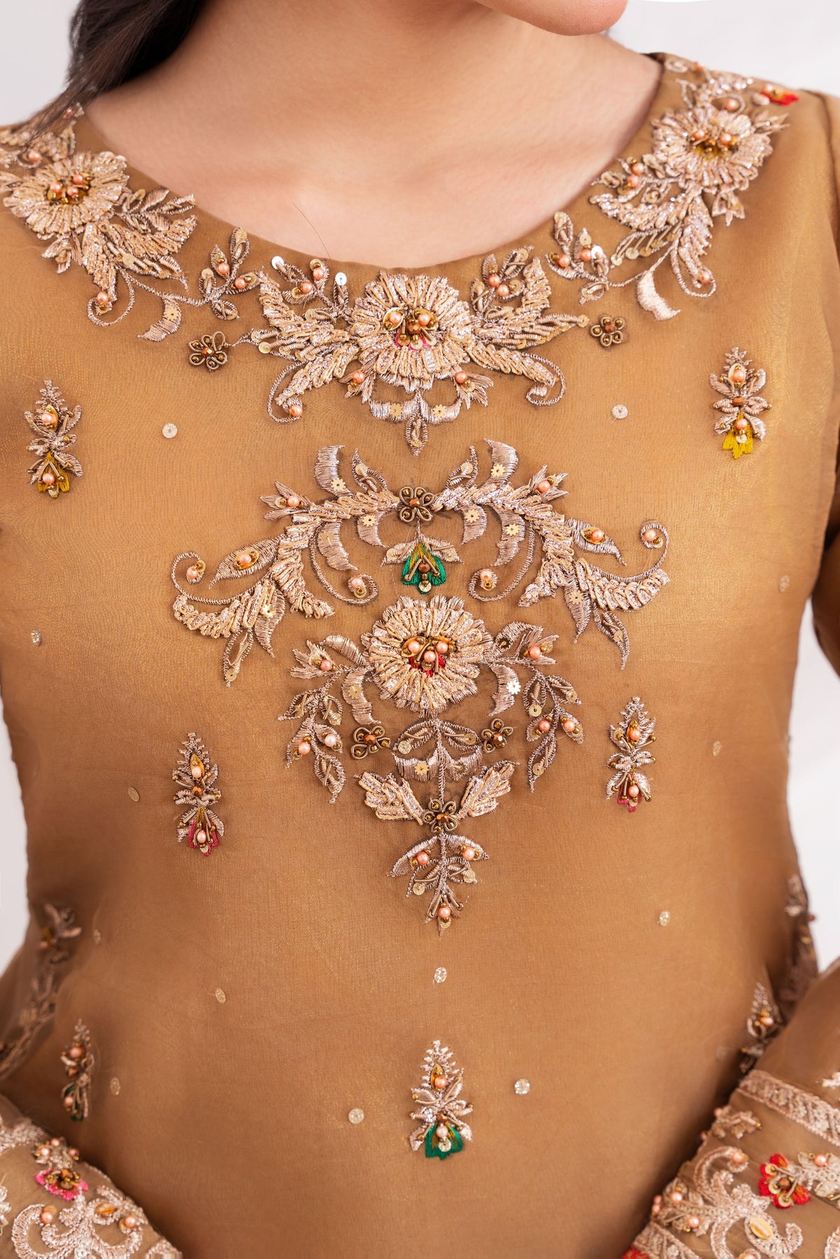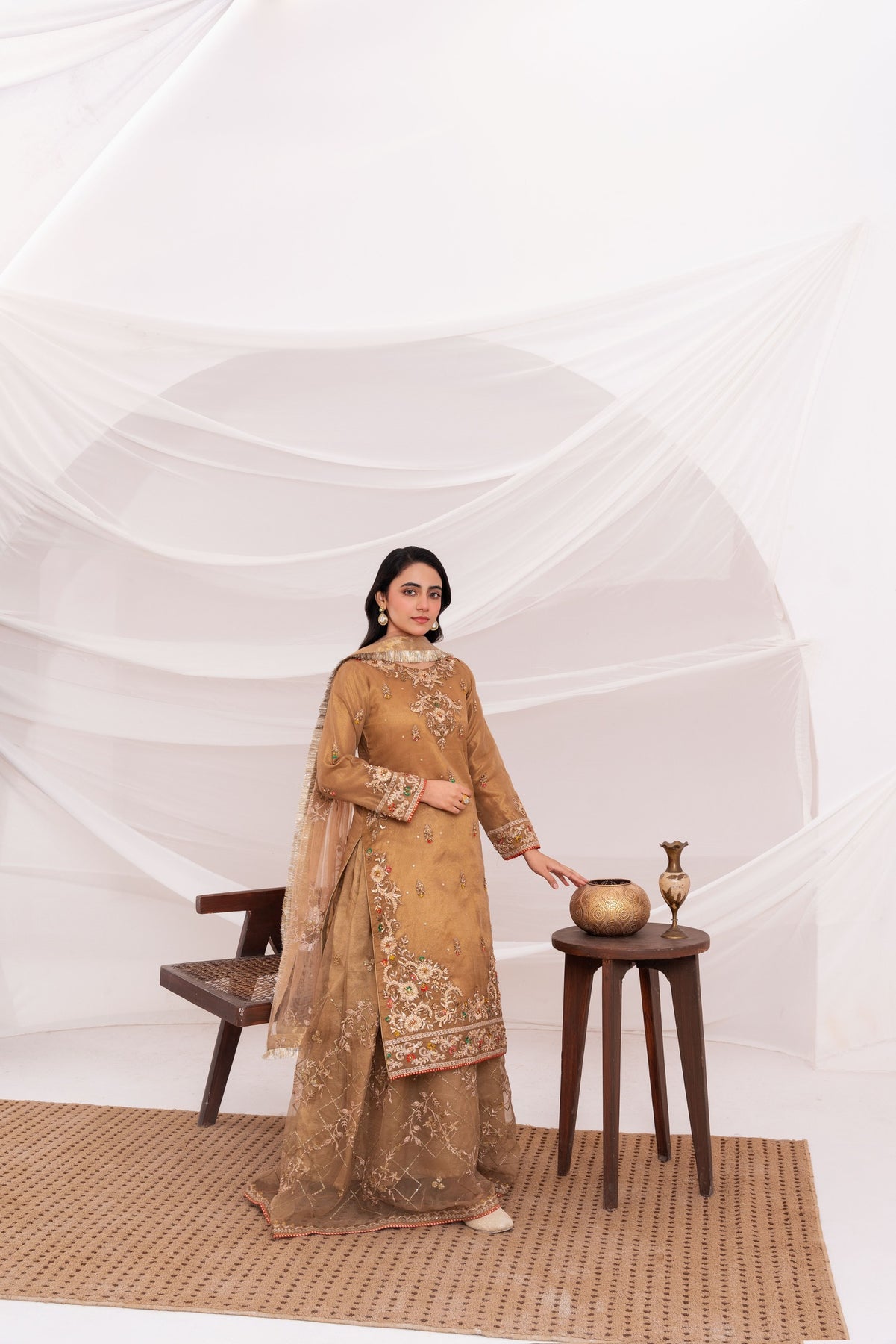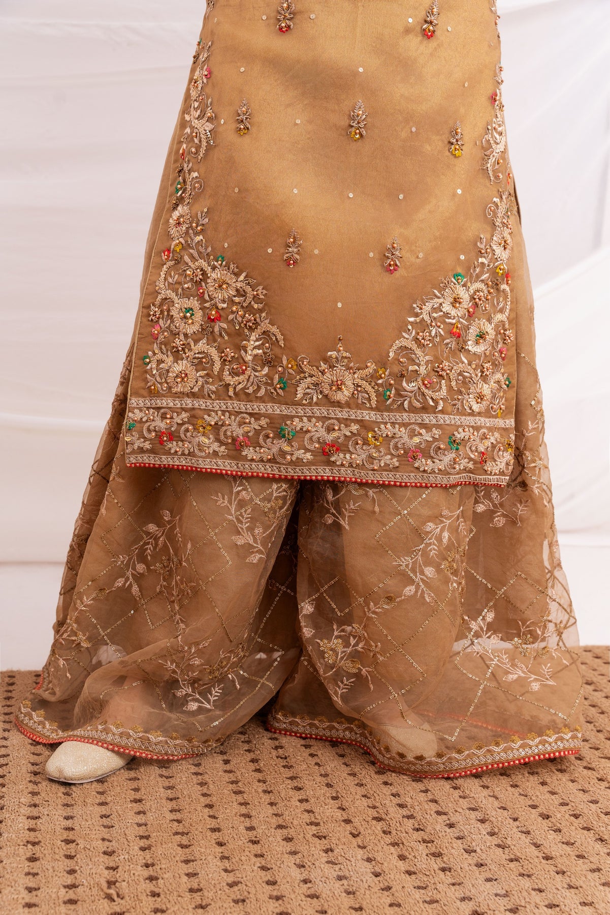 Additional Description: Luxurious organza fabric, both the shirt and sharara offer a soft, airy feel. The shirt is adorned with intricate handwork, featuring delicate cora, dabka embroidery and lustrous pearls, adding an opulent touch. The sharara & dupatta is beautifully crafted with computer embroidery, merging traditional design with modern precision for a rich and textured look.